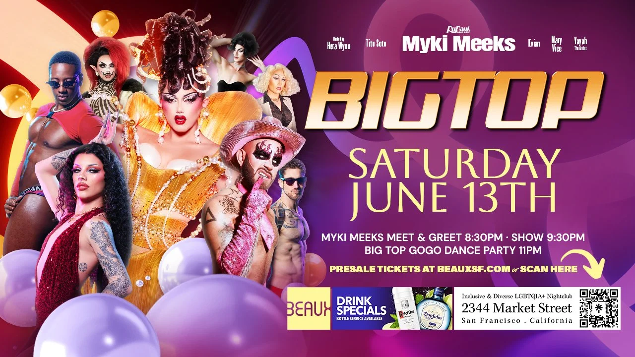 Myki Meeks the darling of Rupaul's Drag Race Season 18 is coming to turn the party at BIG TOP SATURDAY only at BEAUX IN THE CASTRO to celebrate SF PRIDE MONTH. Big Top is now monthly on Saturday nights to offer the best in nightclub entertainment.