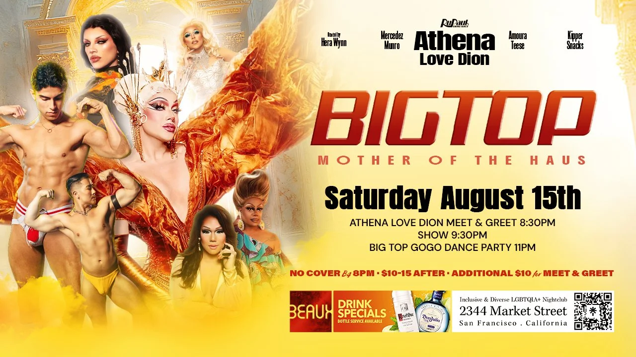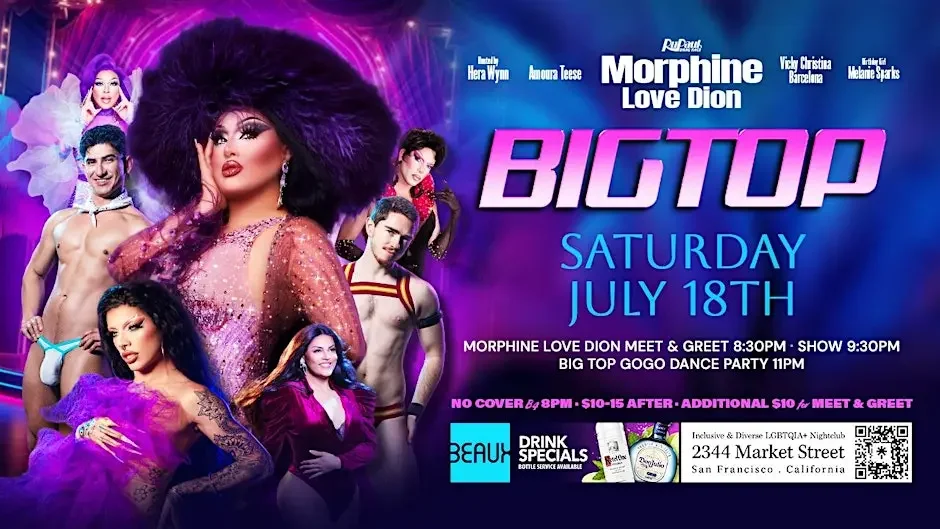 Juicy Love Dion the dancing doll of Rupaul's Drag Race Season 18 is coming to turn the party at BIG TOP SATURDAY only at BEAUX IN THE CASTRO to celebrate Hera Wynn's birthday. Big Top is now monthly on Saturday nights to offer the best in nightclub entertainment.